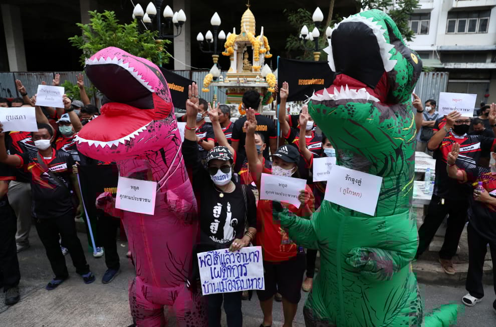 在泰國首都曼谷附近的北欖府(Samut Prakan)的汽車勞工協會(Automobile Labour Congress)附近,人們穿上恐龍裝、比出三根手指,走上街頭響應近日泰國民眾上街遊行爭取民主的示威活動。