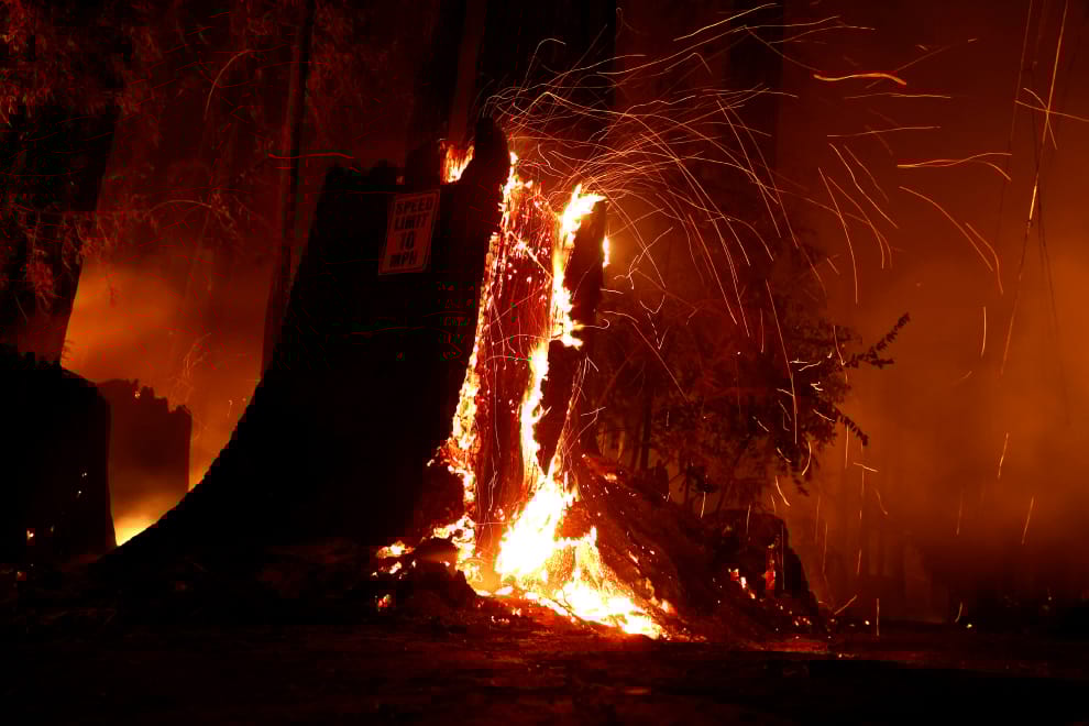 在美國加州的漂礫溪(Boulder Creek),被當局稱為的CZU閃電綜合性大火(CZU Lightning Complex Fire)引燃一截樹幹。