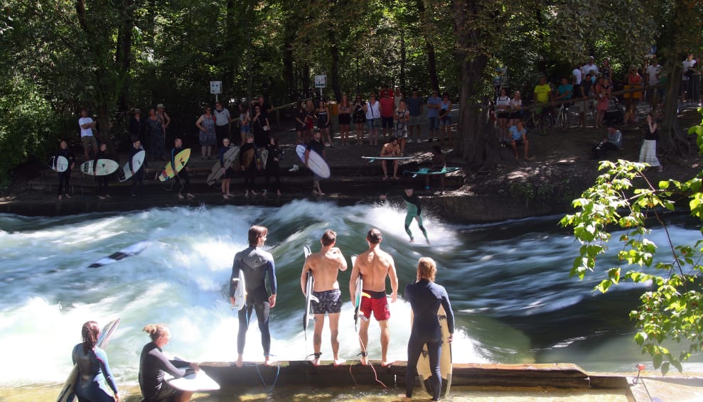在德國大城慕尼黑著名的公園英國花園(English Garden)內的艾斯巴赫河(Eisbach River),一群衝浪客到此避暑順便小試身手。