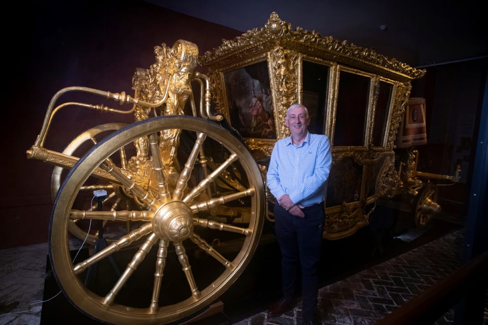 在英國,下議院議長霍伊爵士(Sir Lindsay Hoyle),趁著下周一(24)博物館重新開放前,先行參訪國家信託馬車博物館(National Trust's Carriage Museum),與英國最老的皇家馬車Speaker State Coach合影。