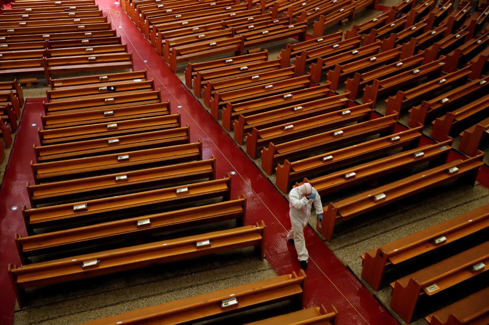 在南韓首都首爾,一名消毒公司的員工正在替全球最大的教會汝矣島純福音教會(Yoido Full Gospel Church)的建築內部消毒。