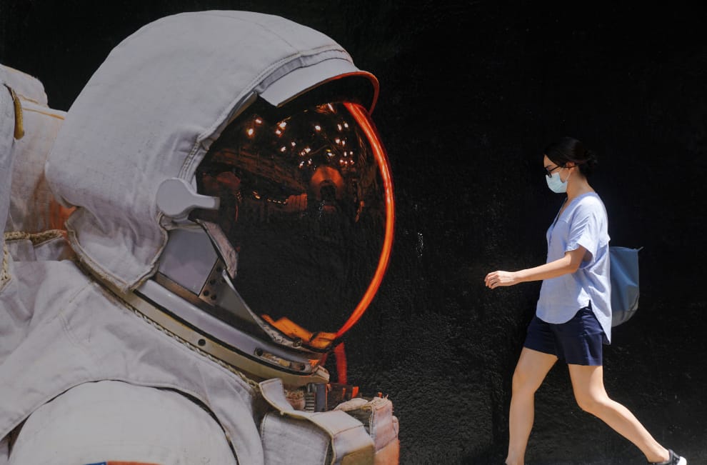 在香港街頭,一名女性經過一幅太空人壁畫。