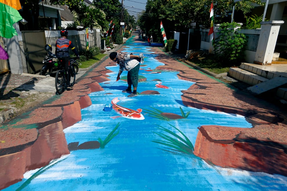 在印尼首都雅加達,一名藝術家在街道上完成一幅 3D版的魚池插畫。