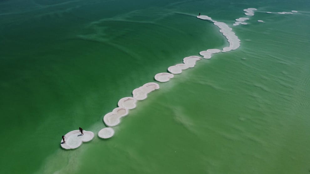 在以色列死海海邊的度假區恩波克(Ein Bokek),觀光客站在鹽巴形成的結晶上。