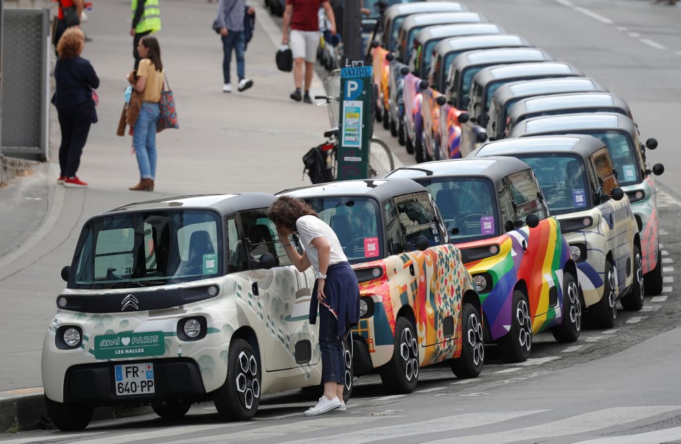 在法國首都巴黎的街道上,法國汽車公司雪鐵龍(Citroen)在街上排出一長串的彩繪電動車AMI,向媒體介紹以AMI為基礎的全新共乘服務Free2Move。
