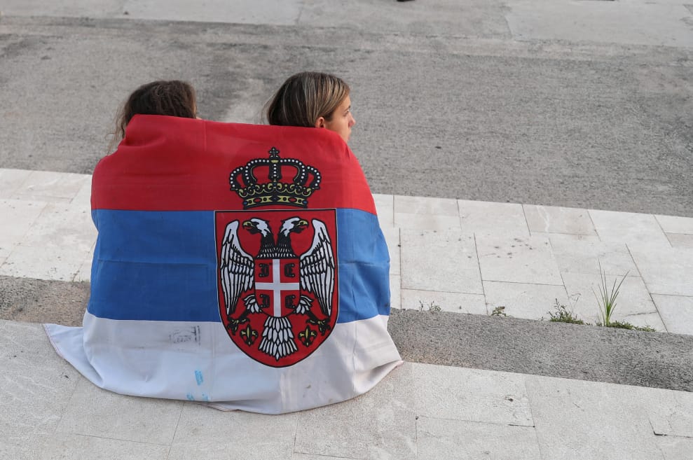 在巴爾幹半島小國蒙特內哥羅首都波德戈里察(Podgorica),兩名於將到來的國會大選中支持親塞爾維亞政黨的女性,一同披上塞爾維亞國旗,坐在塞爾維亞正教會轄下的波德戈里察基督復活主教座堂(Serbian Orthodox Cathedral of the Resurrection of Christ)前的台階上。
