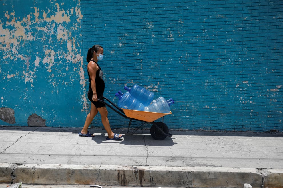 在薩爾瓦多中部的索亞潘戈(Soyapango)的拉斯瑪格麗塔斯社區(Las Margaritas),一名女性用手推車推著數罐裝滿水的塑膠罐準備回家。