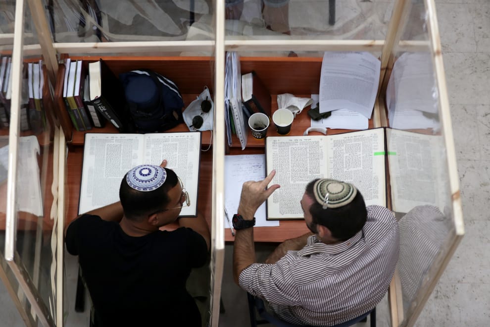 在以色列與加薩邊界的斯德洛特市(Sderot),兩名猶太教的神學生隔著透明隔板相互討論神學。