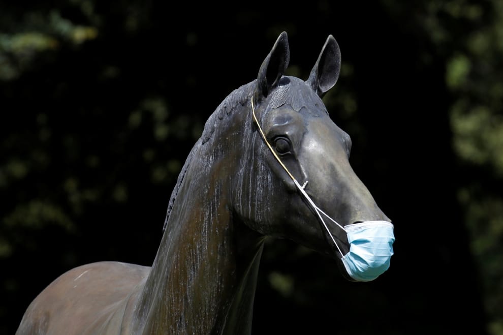 在法國首都巴黎,民眾替隆尚馬場(Longchamp Racecourse)外的一尊馬匹雕像戴上口罩。