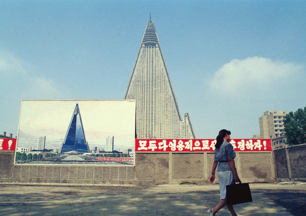 1990年時,一名北韓的女性經過當時仍在興建中的柳京飯店。