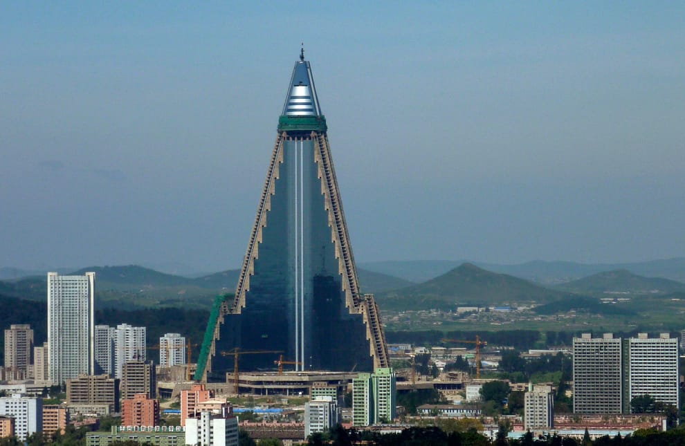 Pyongyang’s Ryugyong Hotel is no longer the eyesore it once was. Unfinished since construction began in 1987, in recent years the exterior been covered in glass and this light show began in July. Maybe someday they’ll finish the interior. pic.twitter.com/MsgqPs3RZK
