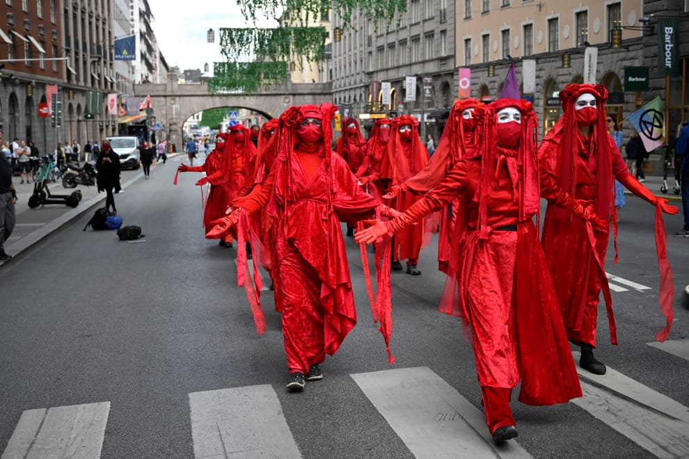 在瑞典首都斯德哥爾摩(Stockholm),環保團體「滅絕反叛」(Extinction Rebellion)成員發起一場遊行。