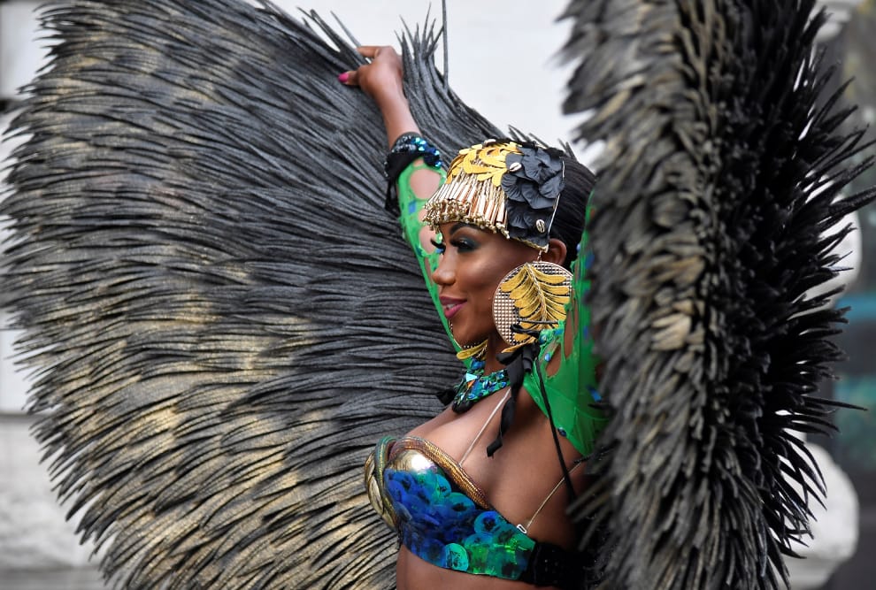 在英國首都倫敦,一名身著華麗服裝的舞者,在大街上宣傳首屆線上版諾丁丘嘉年華(Notting Hill Carnival)。