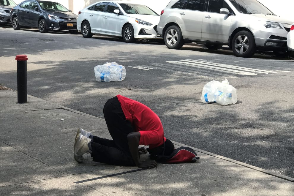 28號傍晚,一名穆斯林在紐約市的人行道上跪下祈禱。