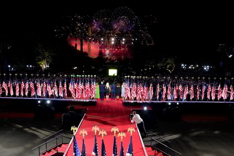 在白宮舉辦的共和黨全國代表大會(Republican National Convention)上,現任美國總統兼共和黨總統大選候選人川普(Donald Trump),在完成提名演說後和家人一塊觀賞天邊拼出「TRUMP」字樣的煙火。