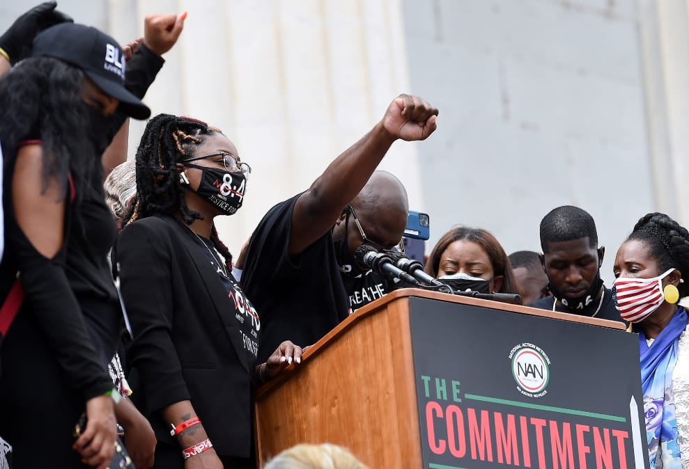 在位於美國華盛頓特區的林肯紀念堂(Lincoln Memorial),黑人男子佛洛伊德(George Floyd)的哥哥菲洛尼斯(Philonise Floyd),受邀出席「把你的膝蓋從我們的脖子上拿開」(Get Your Knee Off Our Necks)活動。活動進行到一半,他在講台上舉起握緊的右手,哀悼離世的弟弟。