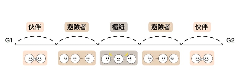 「樞紐」(pivot)是處在兩強之中保持等距關係,不斷擺盪來獲取最大利益,但也可能被兩強施壓懲罰。如同周旋在追求者間,有機會感受熱烈追求,也會引火上身。