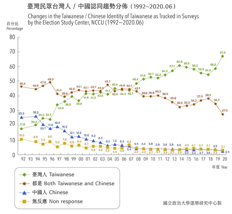 「認同」則會不斷變動,也是重要的國內因素。台灣民眾的國家認同大致以 1994 年「千島湖事件」為分隔,「我是中國人」的認同逐漸下降。陳水扁執政時期,「我是中國人也是台灣人」的雙重認同增加。直到馬政府時代,「我是台灣人」的認同超越了雙重認同。