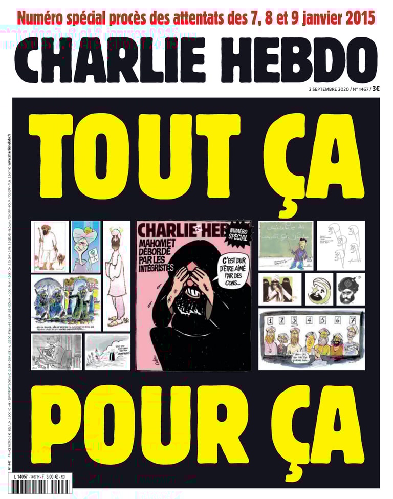 周二(1),在開庭的前一天,《查理周刊》重新刊出了當初引發恐攻的 12幅有關伊斯蘭先知穆罕默德的諷刺漫畫,原本這些漫畫是先刊登在丹麥報紙,隨後才刊登在《查理周刊》上。