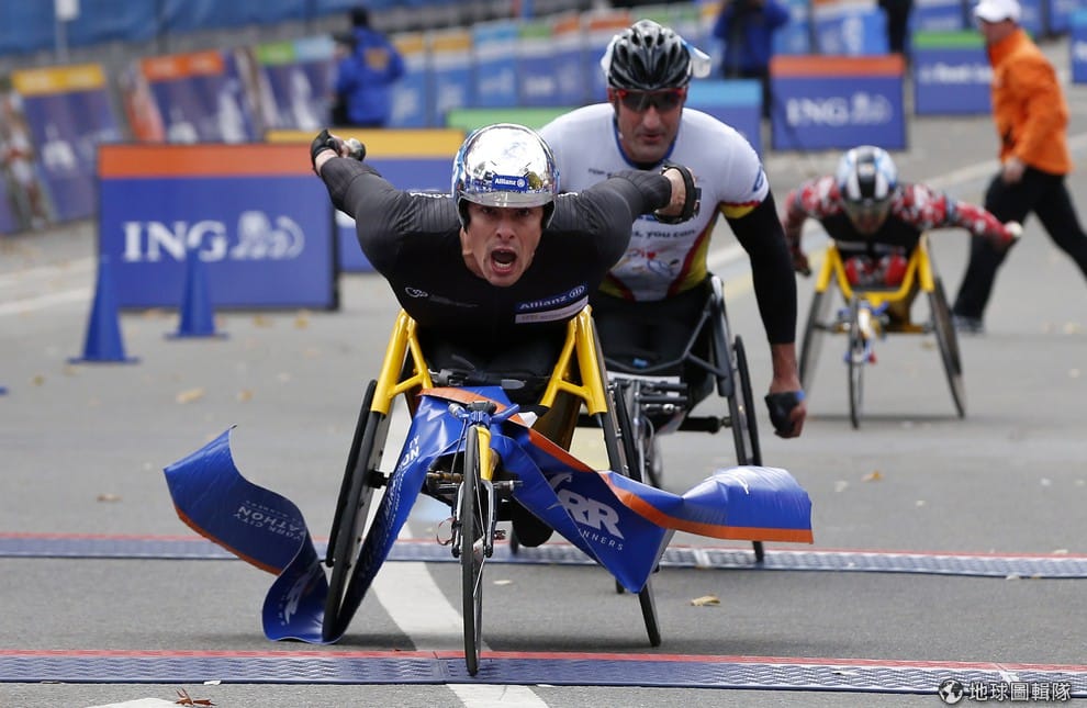 瑞士籍的輪椅好手哈格(Marcel Hug)衝過了終點線,他贏得紐約馬拉松大賽中輪椅組冠軍