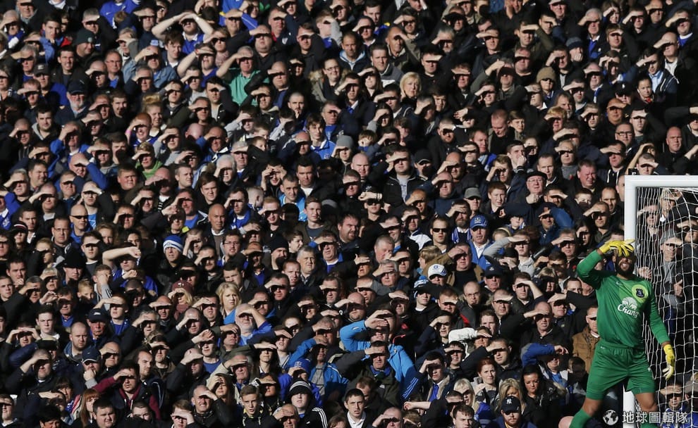 艾佛頓足球隊的守門員舉手遮住刺眼陽光,當地正舉辦英格蘭足球超級聯賽(English Premier League)