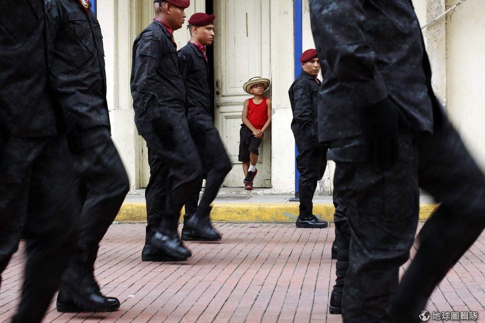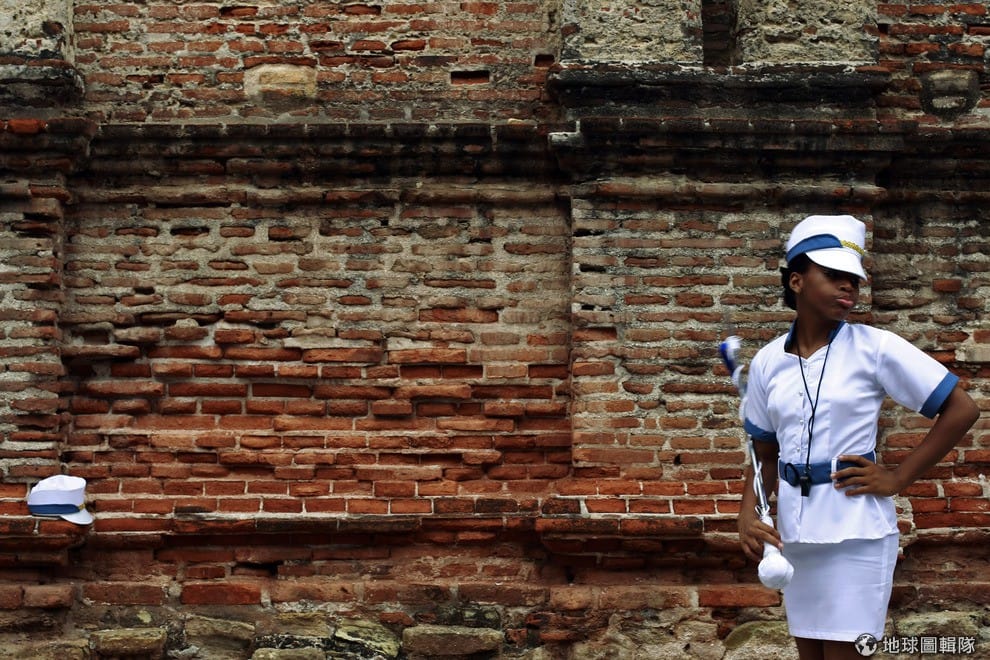 一位學生站在牆邊等待遊行隊伍走過,巴拿馬當地正在慶祝獨立110周年