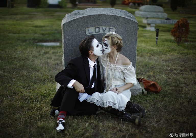 43歲的貝里(左)和40歲的亞力珊卓在墓碑前面親吻,當地正舉辦第14屆的死亡節。死亡節的源頭可以回溯到阿茲特克時期,據傳逝世的人會在此時回來探訪人世間的親友。此時人們會掃墓、準備供品來紀念逝者。洛杉磯當地有490萬來自拉丁美洲的民眾。他們把自己家鄉的文化也帶進了美國