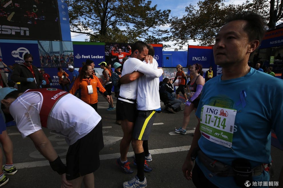 兩位完成馬拉松的跑者開心地抱在一起,總計超過4萬5000名跑者參加了這場蜿蜒過紐約5大區的路跑盛事