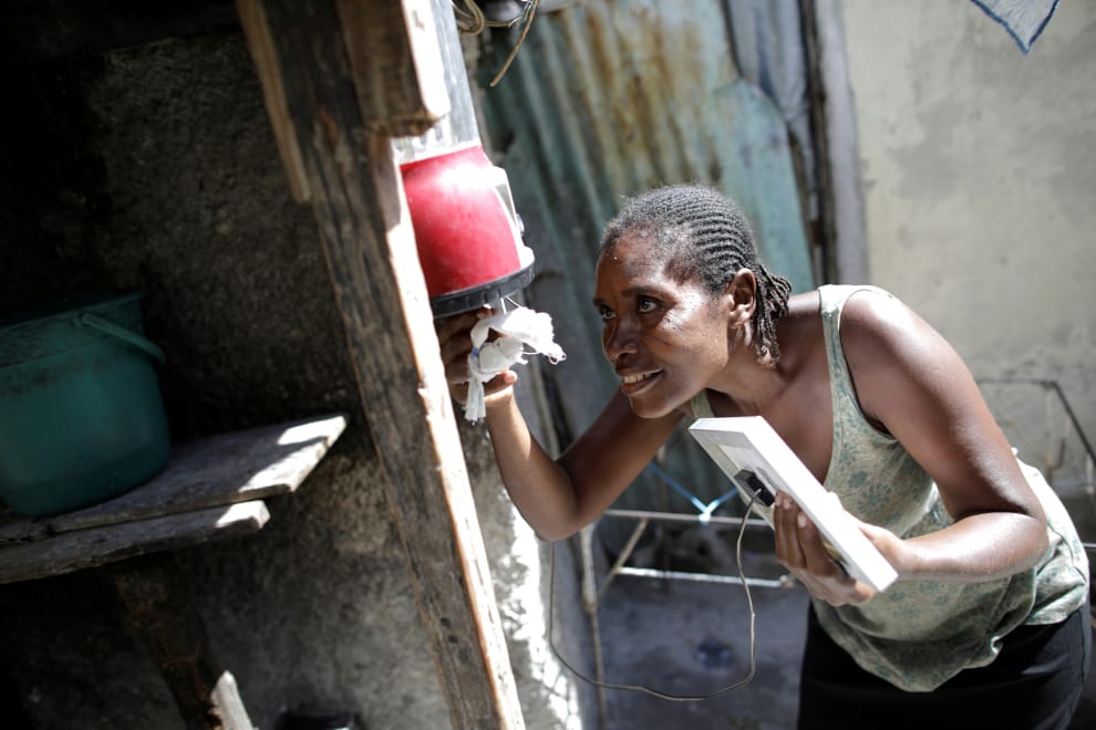 在首都太子港(Port-au-Prince),一名女子正在檢查家中安裝的小型太陽能板。