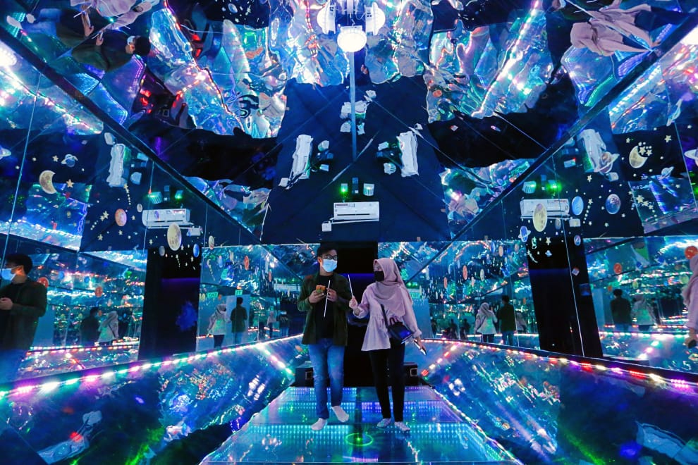 在位於雅加達的魔法藝術 3D博物館(Magic Art 3D Museum)內,參觀民眾戴著口罩遊走在充滿魔力的藝術場景中。