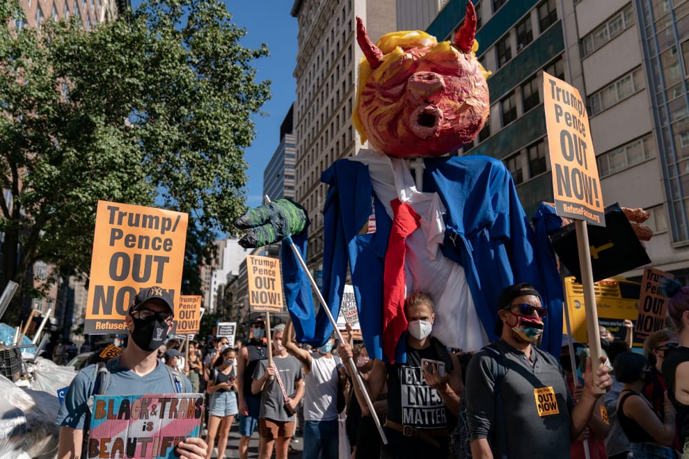 在紐約市,大批遊行民眾高舉寫有「川普/彭斯現在就下台!」字樣的牌子,要求美國現任總統川普(Donald Trump)、副總統彭斯(Mike Pence)下台。
