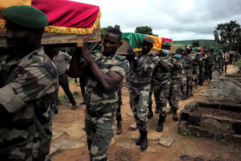 在首都巴馬科(Bamako)郊區的卡提(Kati)軍事基地,軍人們抬著他們在政變中犧牲的同伴棺木準備下葬。