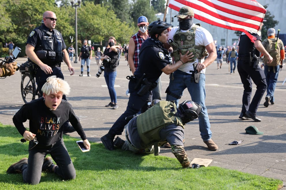在奧勒岡州首府塞勒姆(Salem),警方忙著將發生衝突的川普(Donald Trump)支持者和「黑人的命也是命」(Black Lives Matter,BLM)運動人士分開。