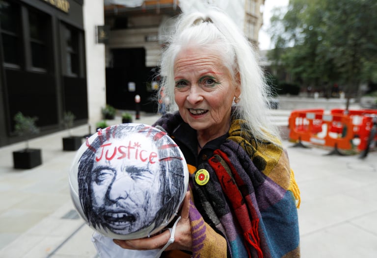 在倫敦中央刑事法院外,英國時尚教母薇薇安威斯伍德(Vivienne Westwood)手持一顆寫有「正義」字樣的球,聲援《維基解密》(WikiLeaks)的創辦人阿桑奇(Julian Assange)。中央刑事法院將決定要不要將阿桑奇引渡到美國受審。如果引渡成立,阿桑奇可能面臨多達 18項罪名指控。