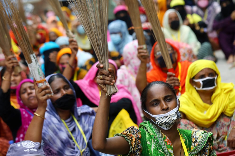 在首都達卡街頭,紡織工廠的員工拿著掃把上街要求老闆按時發薪。
