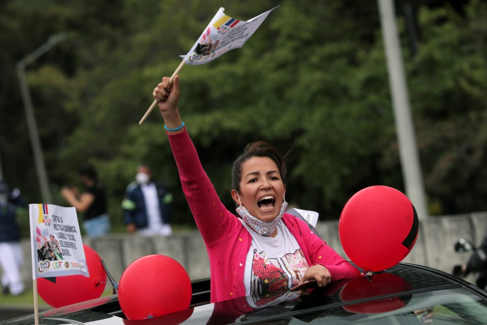 在首都波哥大,一名女子在全國大罷工期間從汽車的天窗探出身來,抗議政府防疫不力讓民生凋敝。