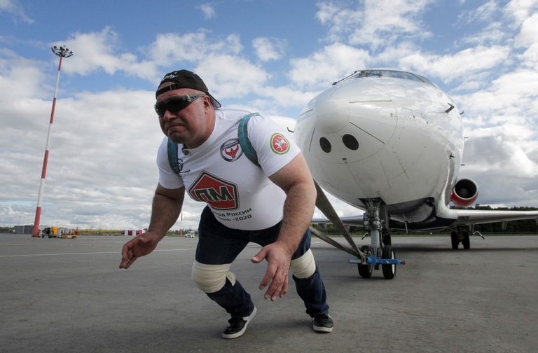 在韃靼斯坦共和國的首都喀山(Kazan),大力士阿加贊詹(Sergey Agadzhanyan)正在挑戰極限,用肉體拖拉一架重達 16噸的龐巴迪(Bombardier)CRJ200客機。