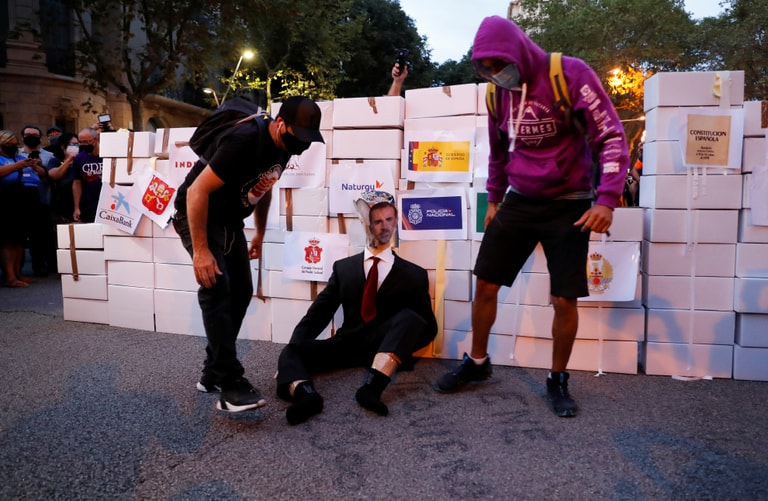 在位於加泰隆尼亞自治區的巴塞隆納,支持加泰隆尼亞獨立的民眾正在紀念一年一度的「加泰隆尼亞民族日」,他們將西班牙國王菲利普六世(King Felipe VI)的人偶放在地上,準備待會放一把火燒掉國王人偶。