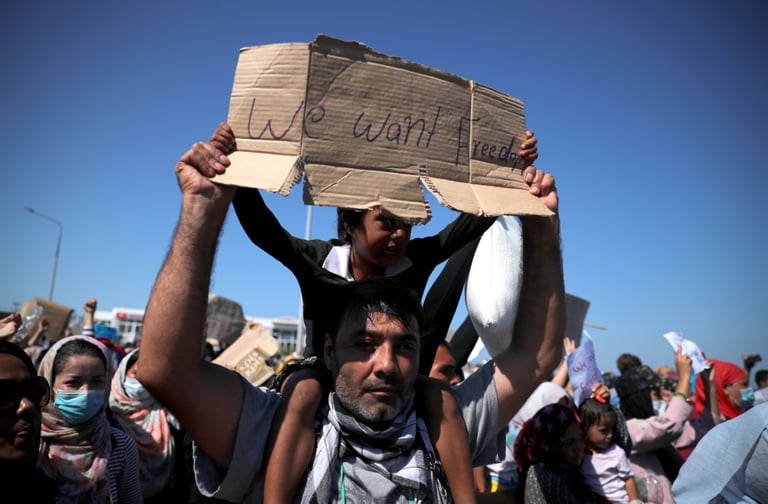 在收容大量難民的列斯伏斯島(Lesbos),無處可去的難民反對當局的安置計畫,高舉寫有「我們要自由」字樣的牌子抗議。