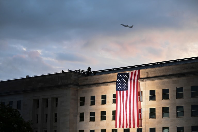 在九一一事件滿十九周年這一天,美國五角大廈掛出了美國國旗悼念。