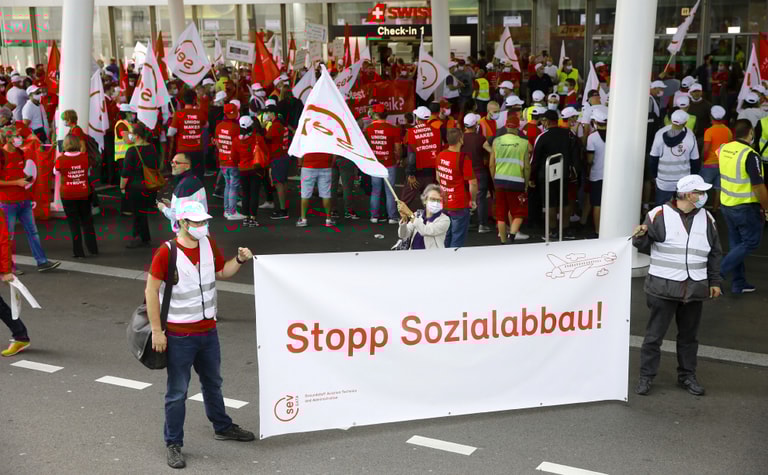 在蘇黎世機場前,扛不住生計的航空業勞工上街抗議,要求政府不要再砍相關預算,讓他們可以在這波疫情中活下去。