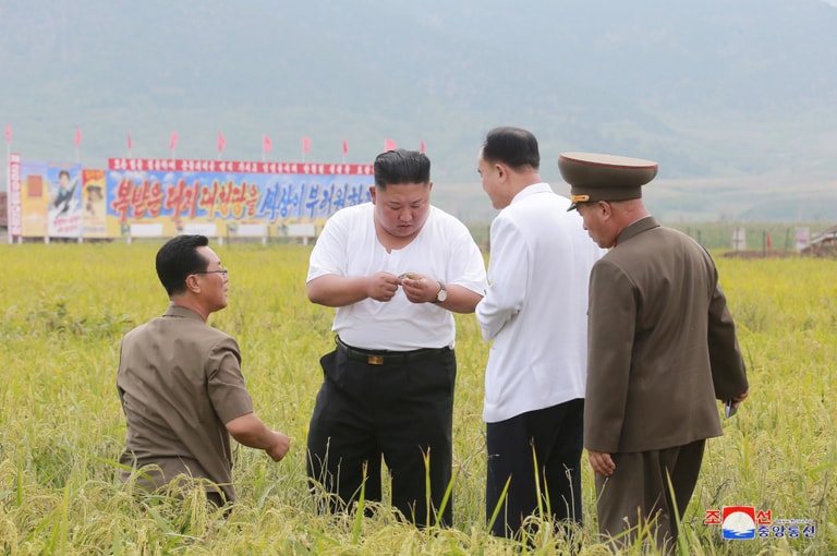 在遭到洪水侵襲的黃海北道(North Hwanghae),北韓領導人金正恩穿著汗衫正在檢視災後現場。