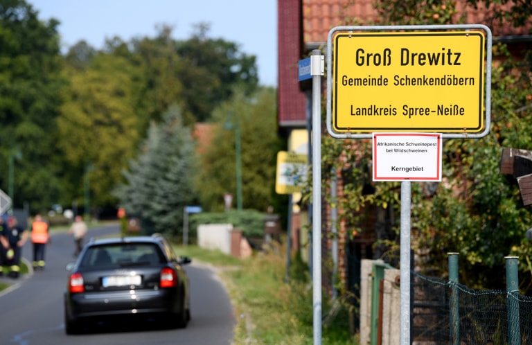 在德國東部的施普利-奈瑟縣(Spree-Neiße),當地政府在路邊豎起一塊寫著「罹患非洲豬瘟野豬重點出沒區」的牌子,並在小鎮周遭豎起鐵網,避免境內第一隻疑似染上非州豬瘟的野豬逃離邊境、散播疫情。