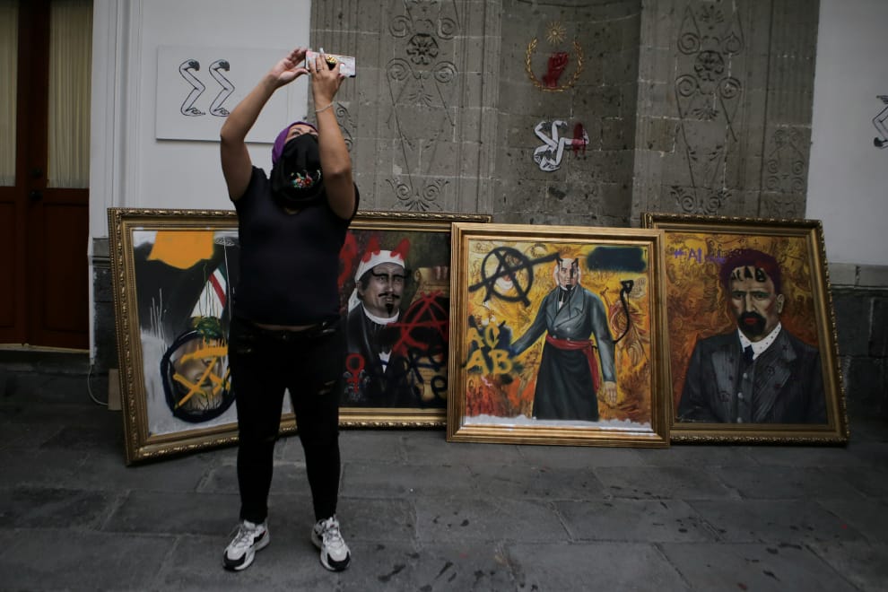 在墨西哥市的墨西哥人權委員會(National Human Rights Commission)大樓外,一名為抗議墨西哥國內性別暴力事件的民眾與大樓外數幅諷刺人權委員會成員的畫作合影。