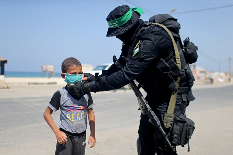 在加薩走廊(Gaza Strip),一名哈瑪斯組織(Hamas)的戰士替小男孩戴上口罩。