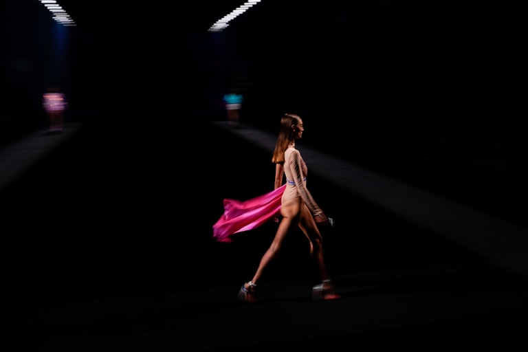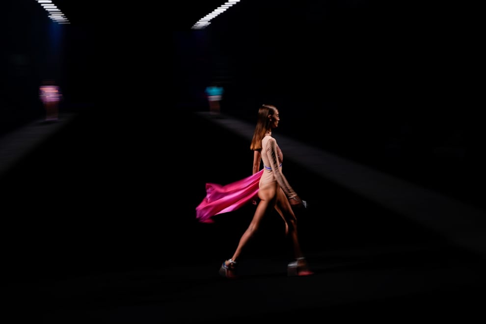 在西班牙首都馬德里舉辦的賓士時裝周(Benz Fashion Week)上,一名模特兒身著Custo Barcelona公司的服裝走過伸展台。