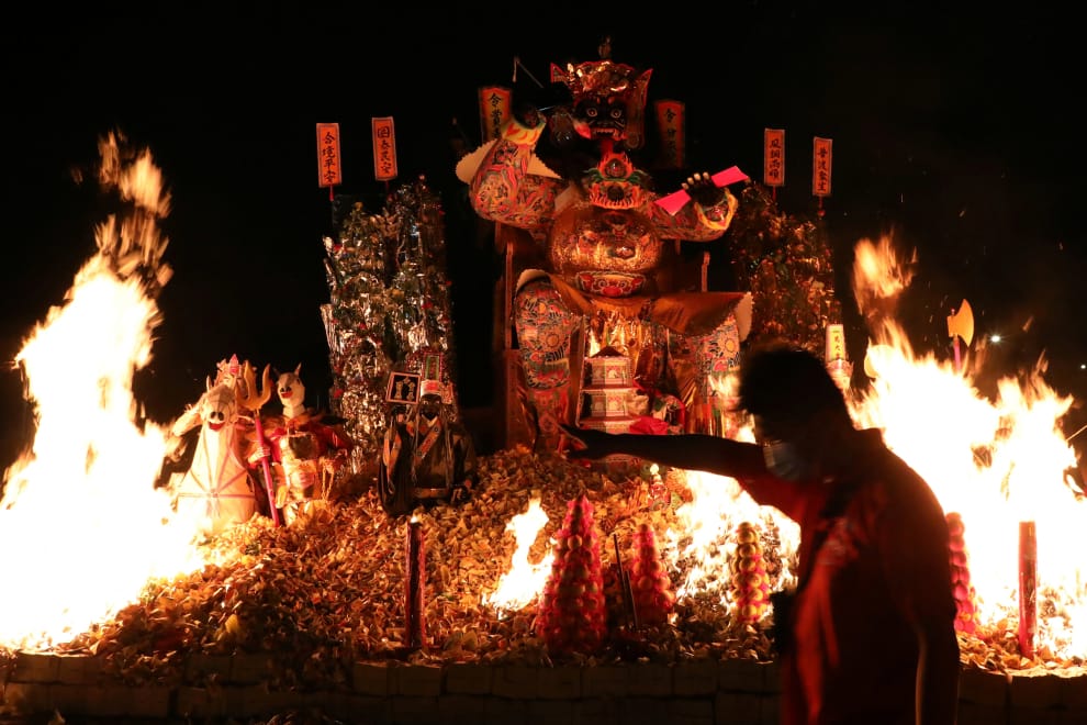 在馬來西亞首都吉隆坡近郊的士拉央(Selayang),一名戴著口罩的男子經過一尊熊熊燃燒的普渡爺像。