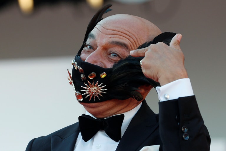 在今年義大利舉辦的第 77屆威尼斯影展閉幕典禮上,一名戴著造型特殊口罩的男子,比出一個有趣的手勢供記者們拍照。