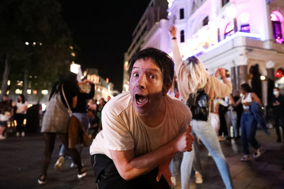 在英國倫敦的萊斯特廣場(Leicester Square)上,一名男子開心地與群眾一同唱歌跳舞。