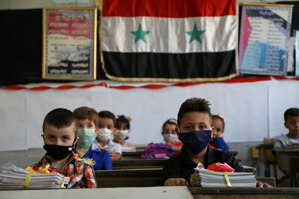 在敘利亞首都大馬士革(Damascus),學校終於重新開學,學童們紛紛戴著口罩進入教室。